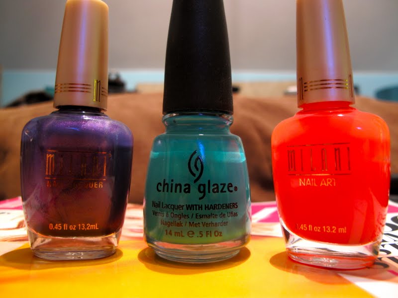 (l to r) Milani Nail Lacquer in Purple Passion, China Glaze in Four Leaf Clover & Milani in Juicy Glo