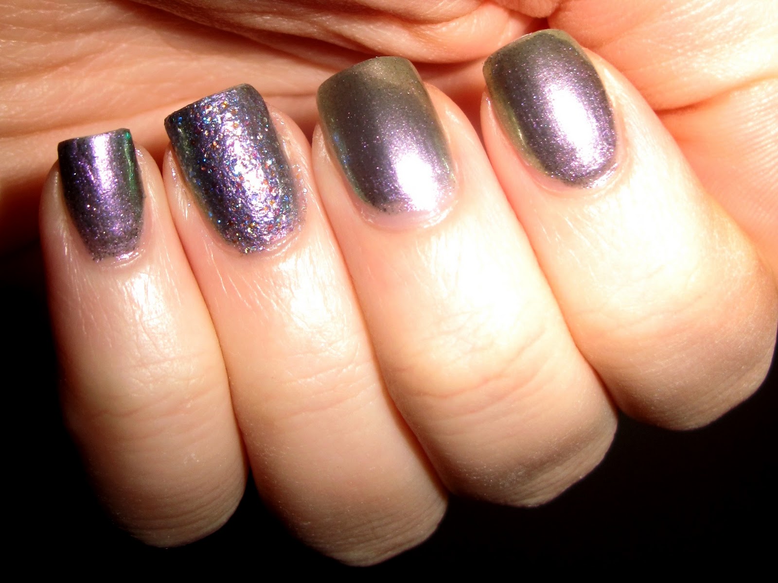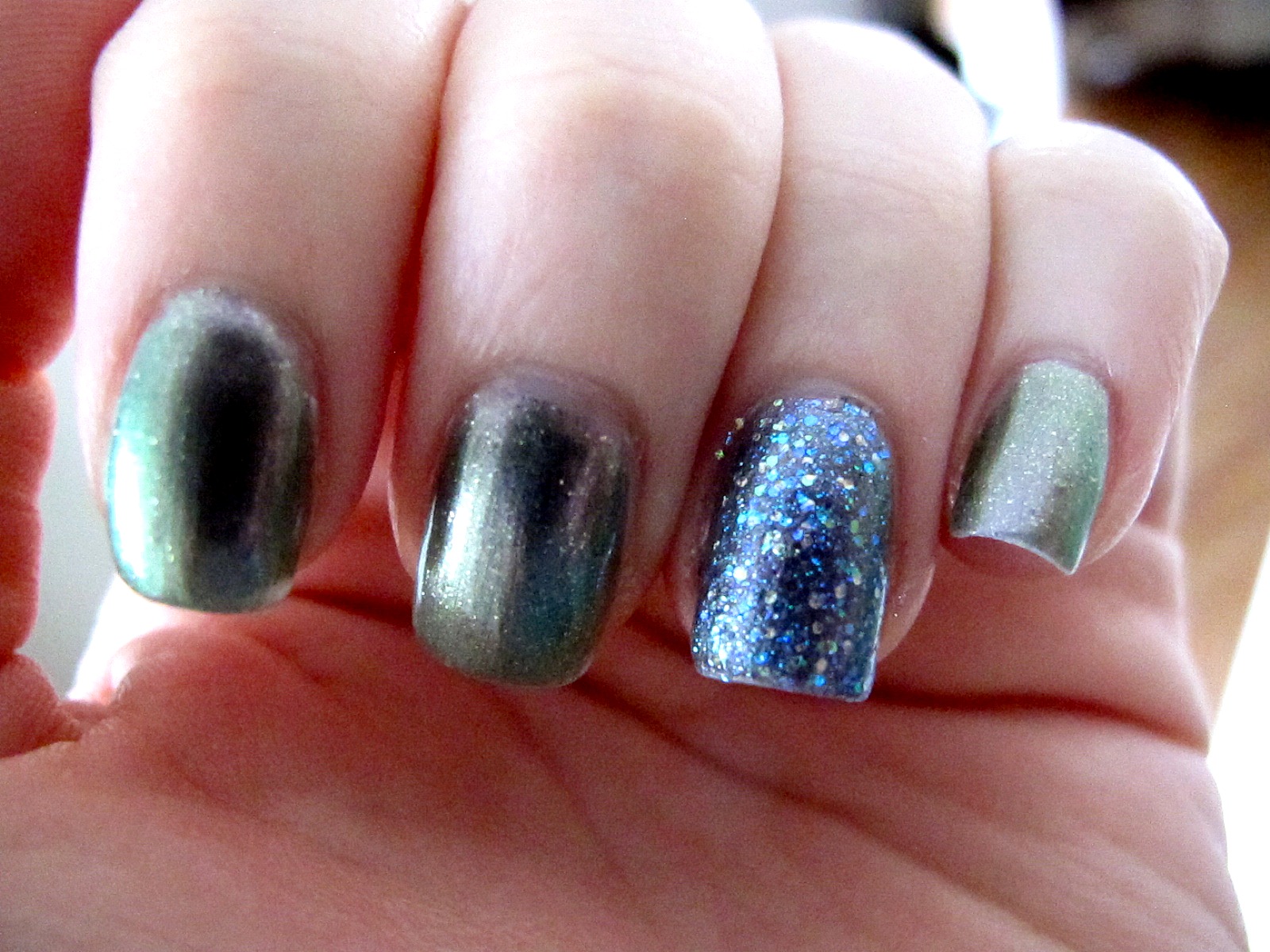 I was soooo excited when my OPI Katy Perry Nail Polish came in the mail!! I couldn’t decide what color to wear first so obviously I had to try 2! These picture don’t even do it justice. “Not Like The Movies” the gray color is perfect, it changes colors in the light…sometimes it looks gunmetal, sometimes it looks pink, sometimes it looks green. Its seriously awesome. Then I layered “Last Friday Night” the sparkly blue color on one nail. My pet peeve about glitter nail polish is the actual polish is never a color, but this one totally is. Its actually blue polish with blue glitter in it. AMAZING!! I’m so glad I opted for the mini polishes because they are the perfect size because honestly who has ever gone through an entire bottle of full sized nail polish..not me…I like too many colors to where the same color that often! I’m still waiting for my Black Shatter Top Coat it should be here next week…can’t wait!!